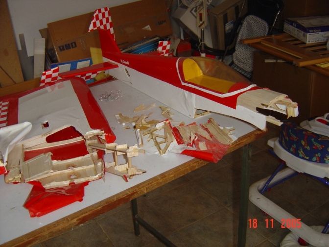 Hola, siento decir esto pero esta mañana disfrutando a tope de mi querido funky se me a partido el ala en pleno vuelo con el consiguiente desastre solo deciros que no lo queme porque me daba pena , se de algun caso mas asique todos los que vayais a hacerlo camibarle los listones principales de las alas por unos de pino en vez de balsa como los que trae ok??? bueno os dejo alguna foto mia y la de otro caso parecido.Saludos