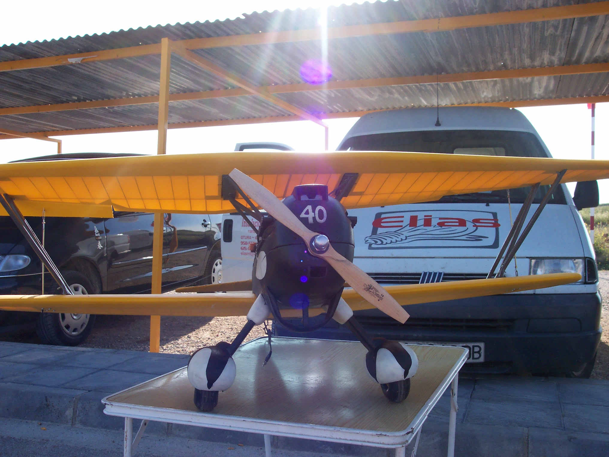 ahora despues de haber comprobado todo ha llegado la hora de su primer vuelo, ya que su primer dueño no la habia estrenado ....me preocupa desde luego su peso....esta en torno de los 5 kilos y tiene una envergadura de 160 el ala superior y 140 la inferior siendo la carga alar 70 grs por dm3...