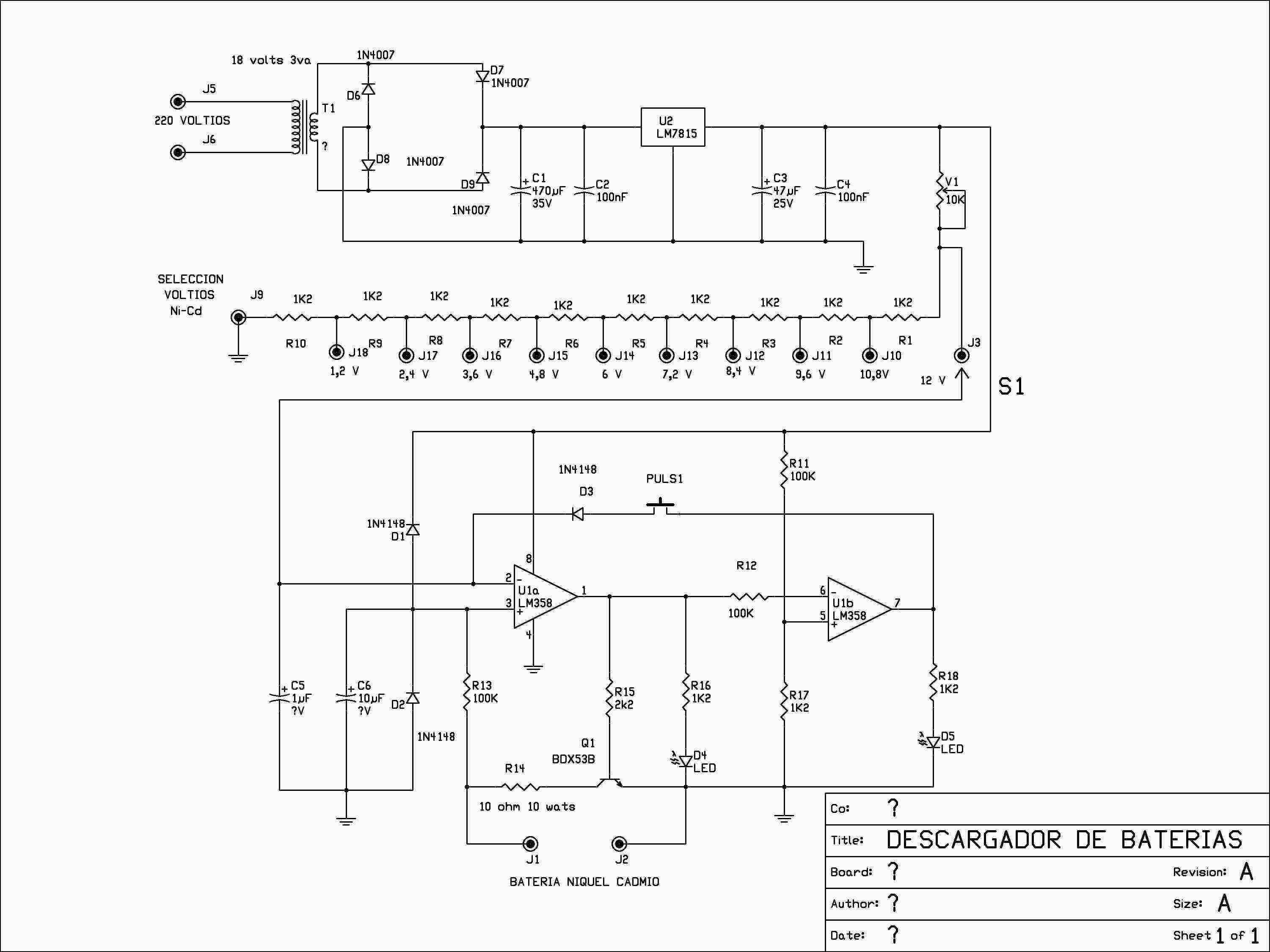 Bueno, yo en mi caso, tengo un descargador parecido al esquema que publica ESCO, en un post anterior, lo saqué de una revista hace años, y permiter descargar baterias de NICD o de NIMH desde 1 elemento hasta 10 elementos.