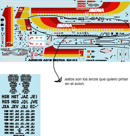 buenos dias estoy terminado de construir este avion, y querria pintarlo como uno de iberia,pero mi problema es como hacer los arcos que lleba,como puedo hacer alugun tipo de plantilla.