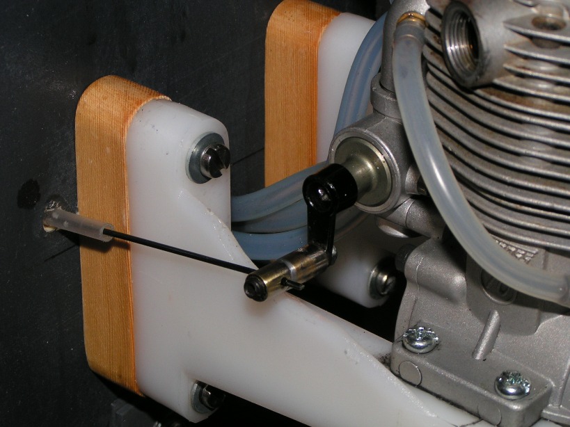 He intentado montarlo de la misma manera, pero al instalar un ASP 91 4T, que es más alto, no me queda del todo bien. Se me ha ocurrido montar un servo, sobre una bancada de contrachapado (5mm) que va atornillada a la cuadrena parallamas (he insertado dos silent-block de servo, para que absorban las vibraciones). De esta manera la transmisión es directa a la palomilla del carburador.