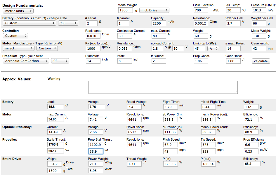 En el resto de los aviones, especialmente si queremos lograr gran velocidad máxima, aceptaremos sacrificar el empuje a baja velocidad en beneficio de una mayor velocidad límite teórica (la indicada como "pitch speed" en el eCalc)