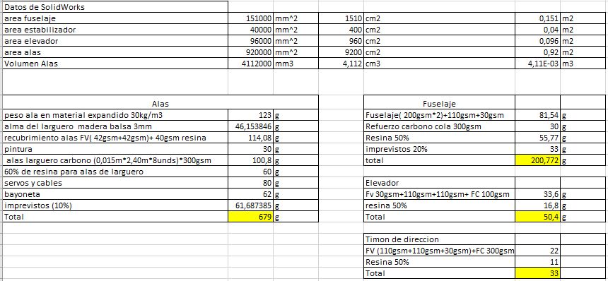 Discúlpame no deje claro lo de las 20 mechas , me refería a mechas en total, no 20 capas de mechas, si fueran 20 capas queda muy pesado tal como me haces la cuenta, lo pensado son 4 capas de 1.5cm por intradós y 4 por extrados , tengo un par de cálculos que hice en el excel y efectivamente 450g no llego ni cerca, decidí bajar el recubrimiento del ala de 110gsm+30gsm a 2 capas de 42gsm creo que sera suficiente, te comparto las tablas de calculo para ver si crees que hay lugares para optimizar peso, saco los datos de áreas y volumen del SolidWorks.