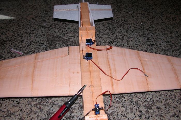 Añadimos los servos y hacemos un agujero para alojar el de alabeo con el cuchillo caliente