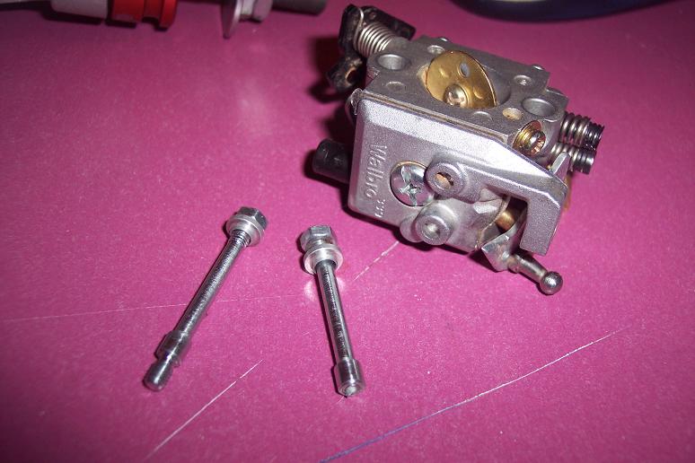 Por lo que preguntas, deduzco que te has podido trincar uno. Como el carburador es un walbro, este esta preparado para admitir tornillos tipo allen de 5mm, la cuestion es que como veras mvvs rosca una parte en el portacarburador y la otra la deja a un casquillo que centra el tornillo y una tuerca para apretarlo (ven en la foto el esparrago izquierdo).