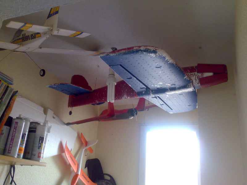 Yo lo tengo colgado mi easy star con una cinta de la pared pero hay que tener cuidado como le pasas la cinta sino cuando abres la ventana y hay corriente se mueve el avion el plano de profundidad se tuerze y deforma