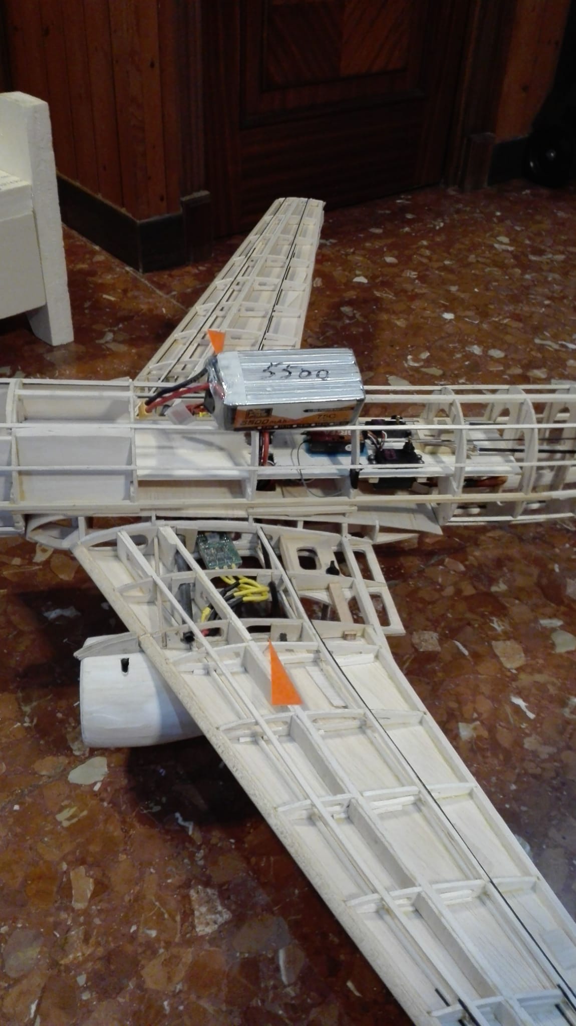 llevaba, una bateria de 3s 5000, en el morro, dos de 2200, en las carlingas. las tres en paralelo.