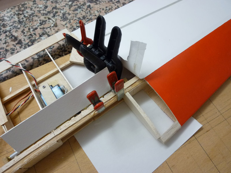 Como había hecho primero el intradós y al ver lo que ocurría, procedí a hacer el extradós de las dos formas, es decir una junta enmasillada y otra sin la masilla con el corte más preciso posible obteniendo este último procedimiento y una vez pintada el ala un resultado óptimo prácticamente imperceptible a 50 centímetros de distancia.