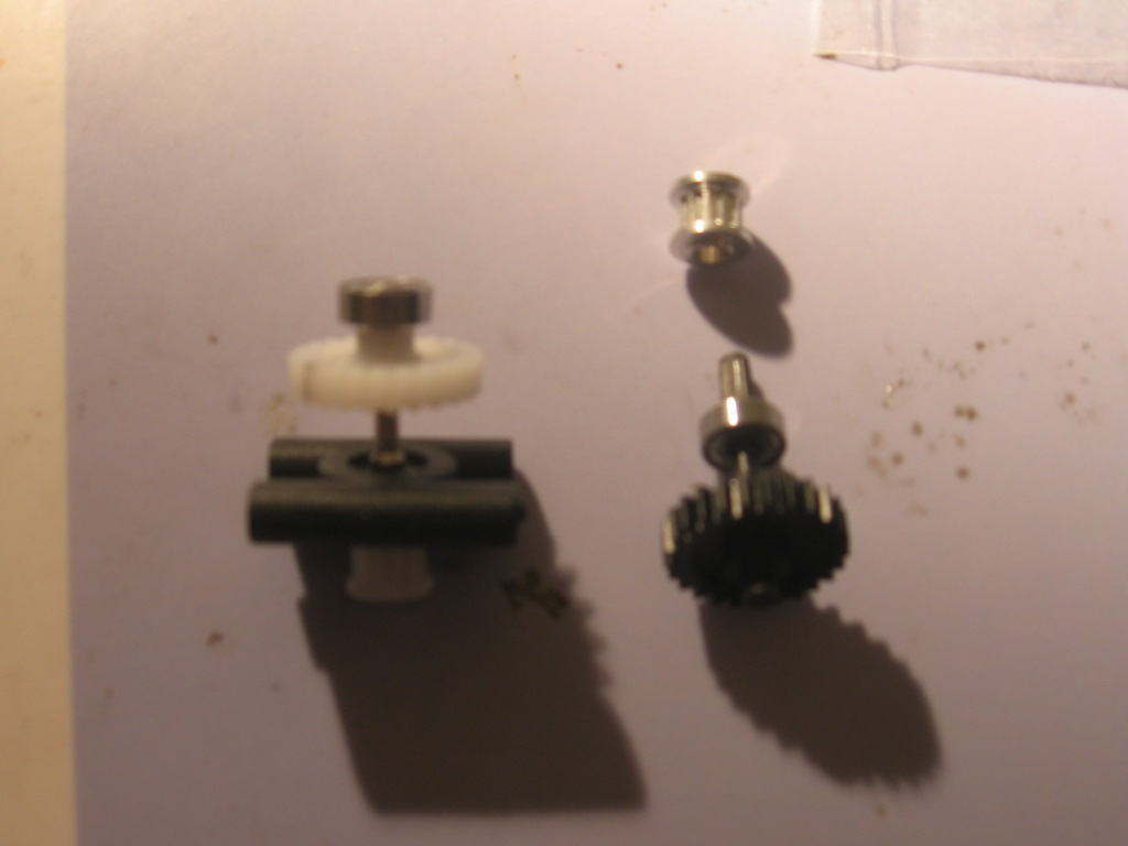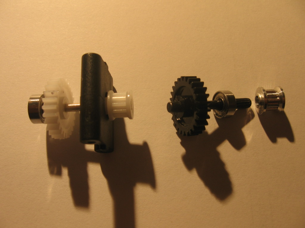El rodamiento de arriba sale tirando de las dos piezas negras veras que se abren por medio, sale como la de abajo, una vez aquí, quitas el piñón superior y por aquí sacas el rodamiento, no es difícil pero si duro, con tranquilidad y aceite sale, no lo fuerces ni le des martillazos si no romperá, aunque con la pieza lo que puedes hacer es añadir el rodamiento de abajo y colocarlo en su nueva ubicación y atornillar al chasis y ya esta, jo que mal me explico.......espero que me entiendas.