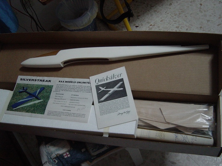 realmente lo que indicas no es raro si el kit viene de una tienda que cerró y quizás le dieron un "plus" al comprador. Habría que ver bien el kit y el contenido, pero de entrada si te digo que lo único de QuickSilver que a simple vista se vé y creo que es lo único que tienes es el manual de montaje. El SilverStreak es el mismo velero de mi avatar que lo presentó K&A como el KAM-U, la única diferencia entre el SilverStreak y el KAM-U era el fuselaje de fibra de SilverStreak. Es avión salió a mediados de los noventas, el KAM-U salió en el 88 y se produjo hasta el 91. K&A no ha cerrado, se ha mantenido en el aire muy a pesar de las situaciones y actualmente tiene el Impulse que es el mismo SilverStreak/KAM-U pero todo compuestos al igual que el MINI I. En líneas generales y si tienes el SilverStreak es un avión más valorado en el mercado de los coleccionables que el QuickSilver y actualmente puedes conseguir 100 QuickSilver por cada SilverStreak. Revisa BIEN los planos y compara los fuselajes porque no recuerdo que el fuselaje del SiverStreak fuése tan agudo en todo caso del SilverStreak salieron tres lotes con los aviones de solo madera y porex (unos 250 aviones). Otro punto a tomar en cuenta es que como K&A sacó los primeros kits en madera posteriormente hizo un "recall" de esto kits y presentando la garantía y la factura del kit te daban gratis el fuselaje de fibra. Si el tuyo es el todo madera sácale crías y NO LO TOQUES porque cuesta unos 380€ en buenas condiciones como se vé la caja, si es el de fibra trata de hacer una matríz del fuselaje y te puedes hacer uno pero igual no toques el original porque debe estar entre 250€ y 290€ y si es del grupo de los "recalled" aunque no aparece en el Collector's Guide debe estar en unos 420€ o 450€