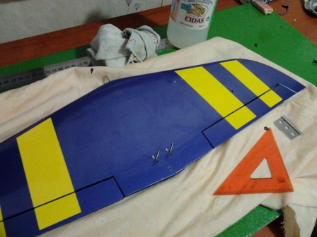 Bueno , hoy hemos echo algo al Limit . Hemos cojido los recortes que sobraron del fuse para terminar los alerones y nos hemos centrado en el intrados del ala decorando unas rayas amarillas con el objetivo de no perderle el norte cuando estemos con el en el cielo, creo que ese contraste de color va a ser visible sin dificultad. Aunque hallamos puesto los alerones aun no estan fijados , lo haremos mas adelante :wink: :wink: