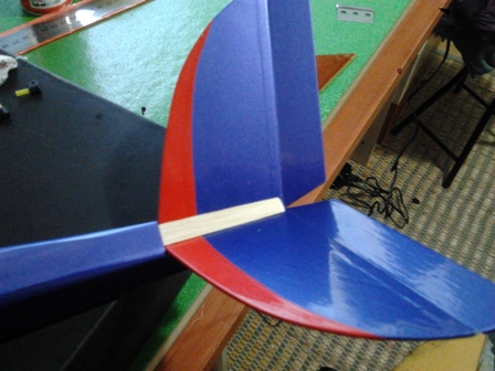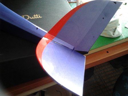 Bueno,hoy le hemos dado otro pequeño achuchón al Limit , nos hemos centrado en pegar los alerones , tambien hemos forrado la caja para el anclaje del servo de ala y preparado ya para su pegado final. :D Decidimos ya de colocar las dos mitades de la cola en V del Limit y acoplamos y colocamos un refuerzo en balsa dura en su parte superior de la profundidad para que quede mas robusta uniendo tambien por esa zona ambas mitades , pero antes de su pegado decoramos :wink: :wink:
