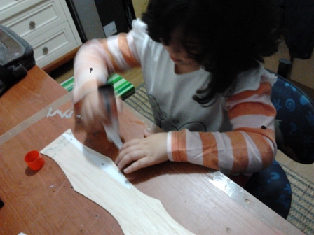 Bueno , ayer noche hicimos algo de este LIMIT , preparamos la mesa de trabajo ,tras quitar los pesos a las cuadernas , cogimos barra de pegamento escolar para pegar el papel a la balsa , buscamos en los retales para pegar tambien las costillas , estas en balsa de 2mm . Se nos presenta en el taller la benjamina de la casa queriendose poner tambien manos a obra , pues nada, ocupo su sitio y tras breves explicaciones nos pego todas las costillas de papel en la madera, y mientras que se seca un poco el pegamento y coje su dureza nos diponemos a calcar y a recoltar los laterales del fuse . Hasta ahi fue todo del ratito de ayer , hoy haremos algo :wink: :wink: