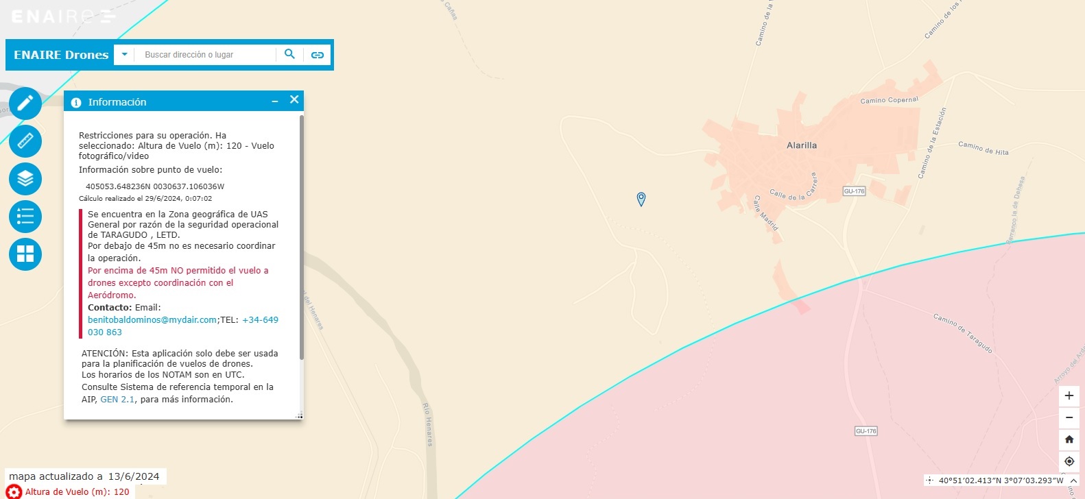 En la esquina inferior izquierda puedes cambiar la altura y si vuelas con cámara o no, si vuelas con cámara te saltaran más restricciones según la zona, siempre prueba esos cambios de parametros. Por defecto te viene CON CÁMARA y 120m ..... Mantener la cámara te aumenta las restricciones, recuerda, para ENAIRE solo les interesan los multicopteros o FPV, si no vas a utilizar cámara te recomiendo cambiar ese parámetro.