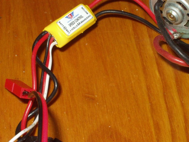 La parte donde salen cinco cables, los dos gruesos rojo y negro son para BATERIA y los tres finos, blanco rojo y negro, son el BEC.