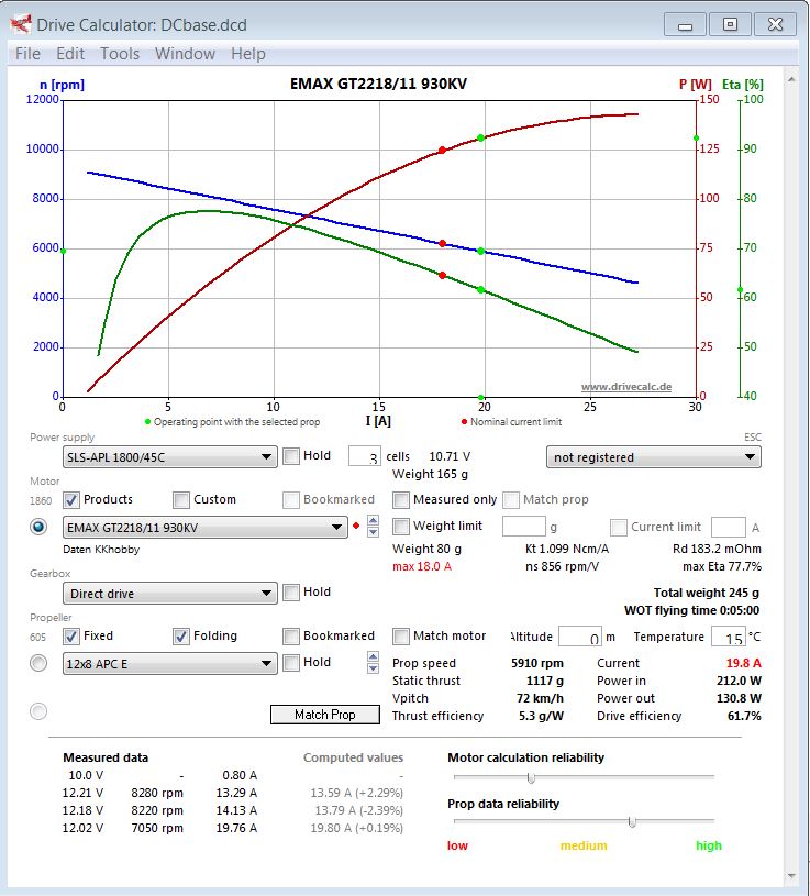 Lo he metido en Drive Calculator, con hélice de 12"x8" y una batería 3s 1800mAh 45C ......