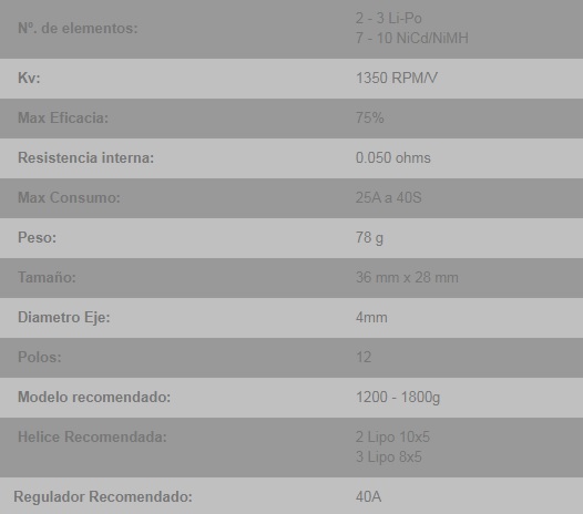 Motor de la clase 350 W, apropiado para modelos 3D de entre 900 y 1.300 g., acrobáticos de hasta 1.600 g., o entrenadores de hasta 2.000 g. También para veleros.