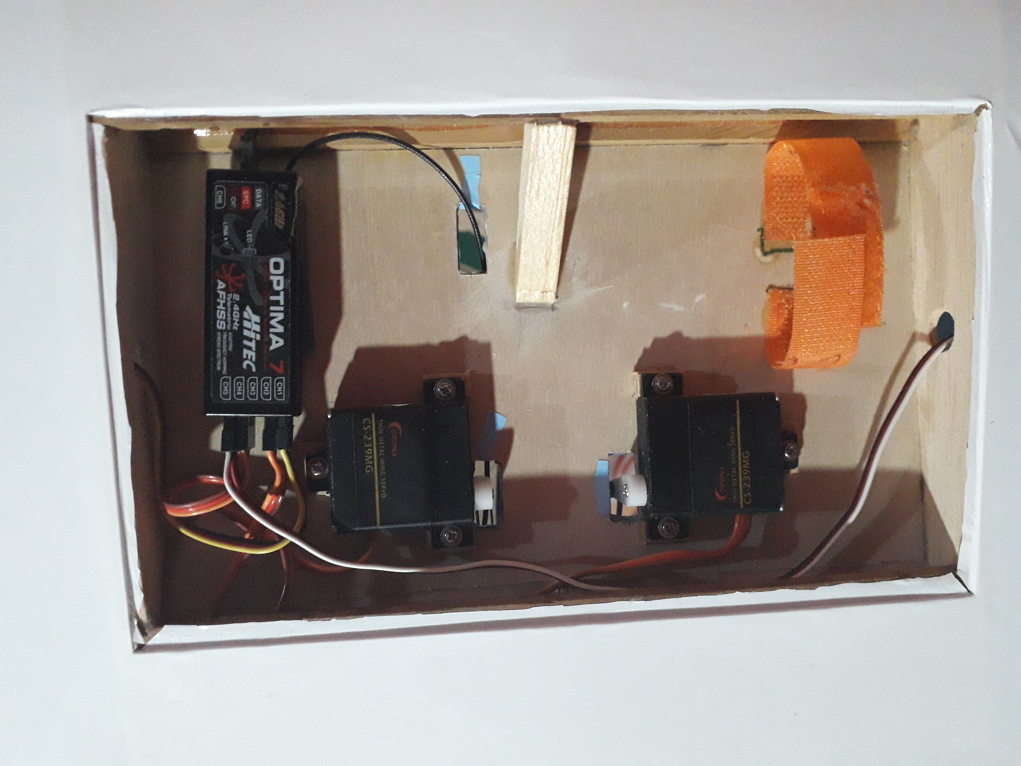 Servos y receptor, creo que sacaré la antena por fuera. También se aprecia que cuando estaba preparado para glow lleva para sujetar las baterías.