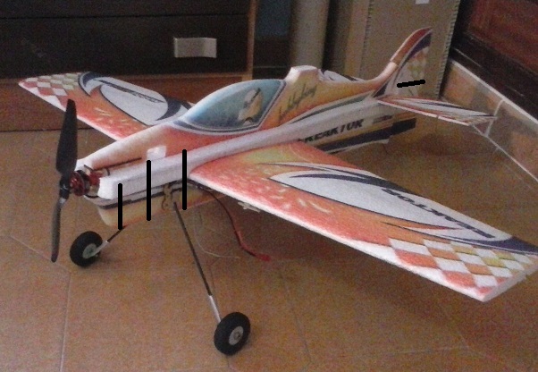 Me queda añadir unos 3 listones de carbono de 2mm delante, y uno en el timon de dirección de 1mm, tal y como los he pintado en la foto.