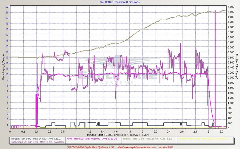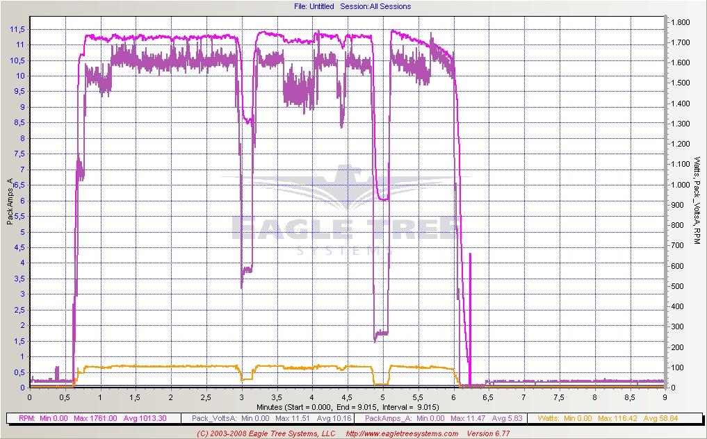 Aqui os dejo un grafico de un vuelo en estacionario en el que se puede apreciar los valores de consumos, los amperios que ha ido soltando junto con los watios y rpm, la temperatura no la he puesto, pero llegaba a 41 grados en la lipo.