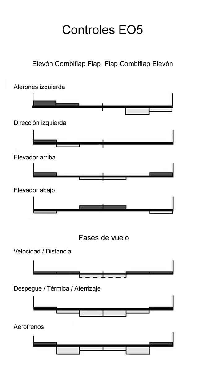 La simplicidad termina ahí, porque estará controlado por 6 flaps, es decir 2 elevones, 2 flaps y 2 combiflap. Este sistema tiene le ventaja de poder optimizar el ala para cualquier régimen de vuelo, además de poder conseguir mediante combinaciones de estos: elevador, alerones, dirección, flaps y aerofrenos.