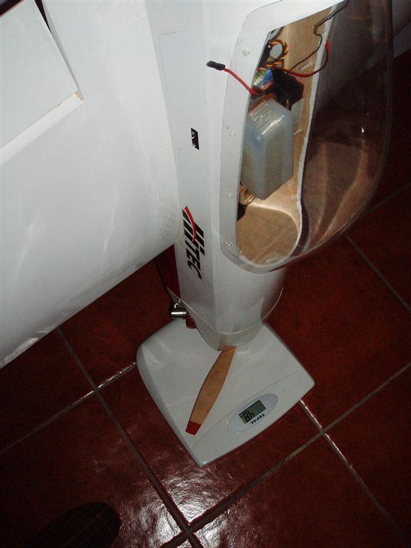 Adjunto foto, del peso en la báscula. Otro sistema para pesar el avión es pesarte tu y luego pesar con el avión en brazos, la diferencia de peso será el peso del avión.