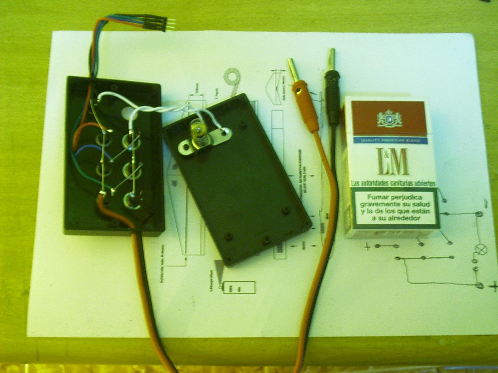 CUIDADO que el esquema de XIMOCAT, no está puesta la lampara, si se usa tal cual está dibujado al pulsar los botones ponemos las baterías en cortocircuito.