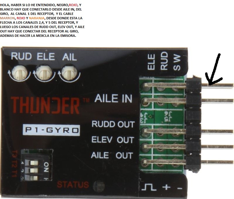 Partiendo de que del ch1 del rx al " ale in" de estabilizador va el cable macho macho de tres hilos, luego hay que poner en el rx los tres conectores de un solo hilo en el pin de señal "s" siguiendo el orden elev, rudder y aux. El aux sera el canal en el que instales la mezcla +100, 0 -100.