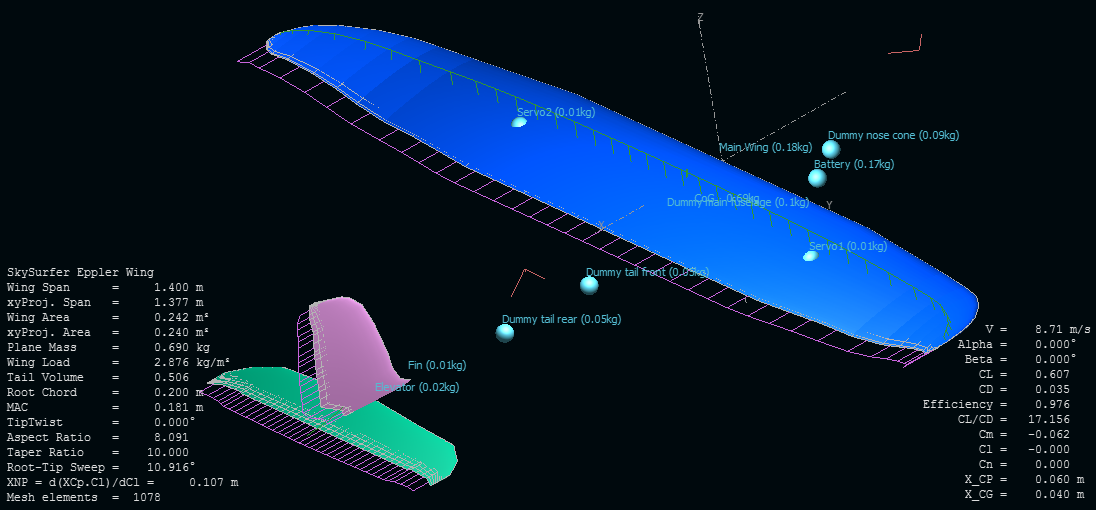 He estimado las masas de los componentes de EPO, y he metido masas puntuales como motor, servos, baterías, receptor y ESC. Un poco a ojo. Queda en 790g, el CG no sé si está del todo en su sitio, pero la batería se puede mover dentro de las masas puntuales del avión completo. Hay dos servos asociados a las alas, y el resto asociado al fuselaje.