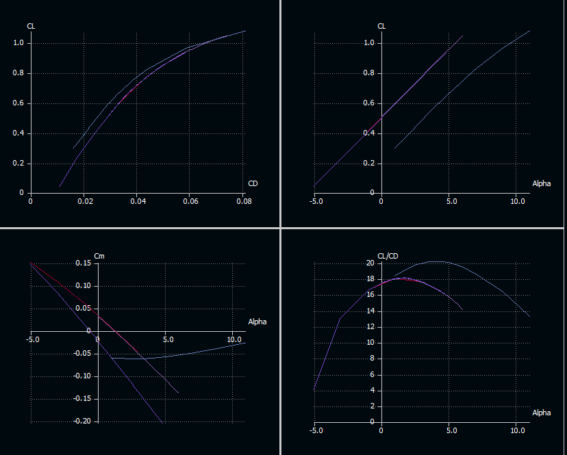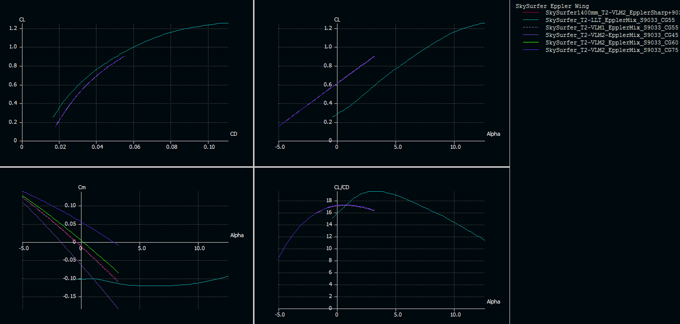 He lanzado análisis con la distribución de masas del avión, de los tres tipos: LLT, VLM1, y VLM2. Entre los dos últimos no he visto diferencia, el primero como es del ala sólo tiene un coeficiente de momento Cm más raro, no lo que cabría esperar de un avión estable (una recta con pendiente negativa). A cambio, nos permite llegar más cerca de la pérdida del ala, pero ojo, sin tener en cuenta su incidencia, por eso sale desplazada en el eje "alfa". Como el perfil Eppler Mutante que hemos creado tiene un Clmax de 1.4, también hay puntos a partir de 14º de ángulo de ataque que no se alcanzan, porque pediría Clmax mayores de 1.6 a Rn~60.000... no va a pasar, nuestro perfil sólo llega a 1.4 a unos 10º y Rn=900.000.