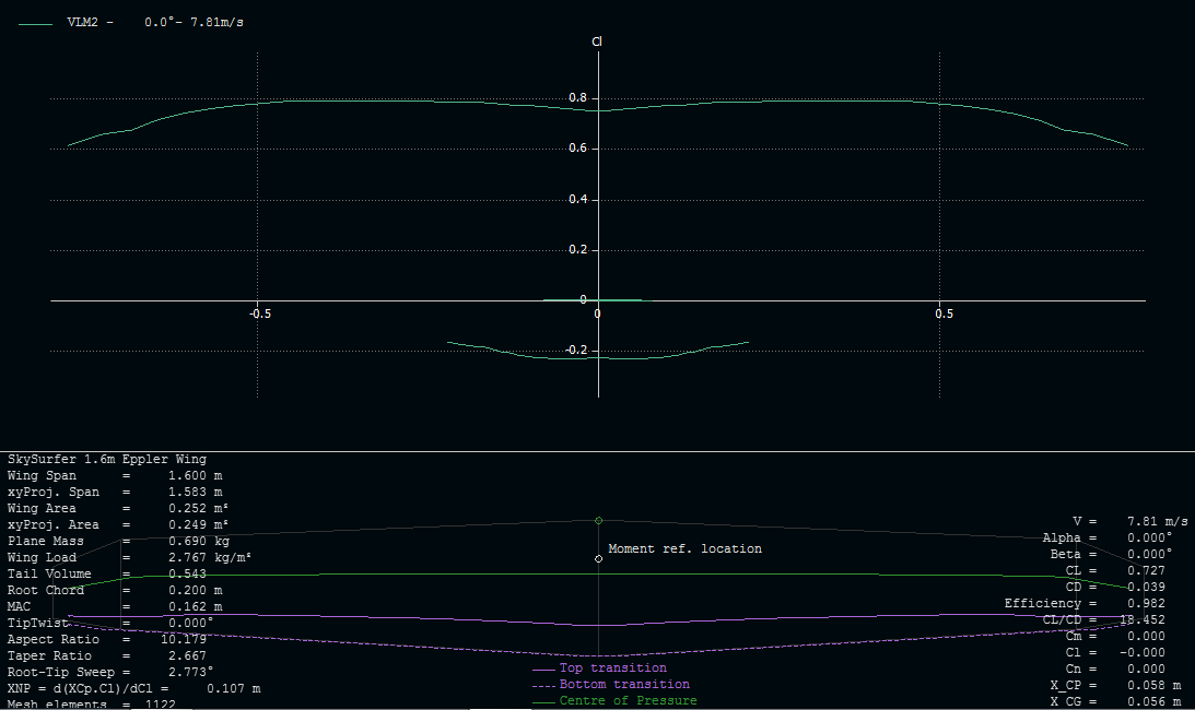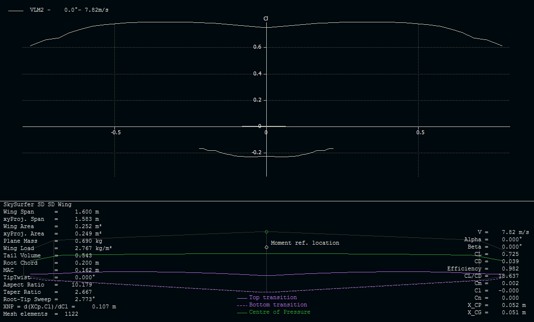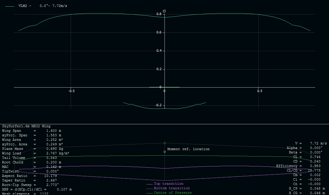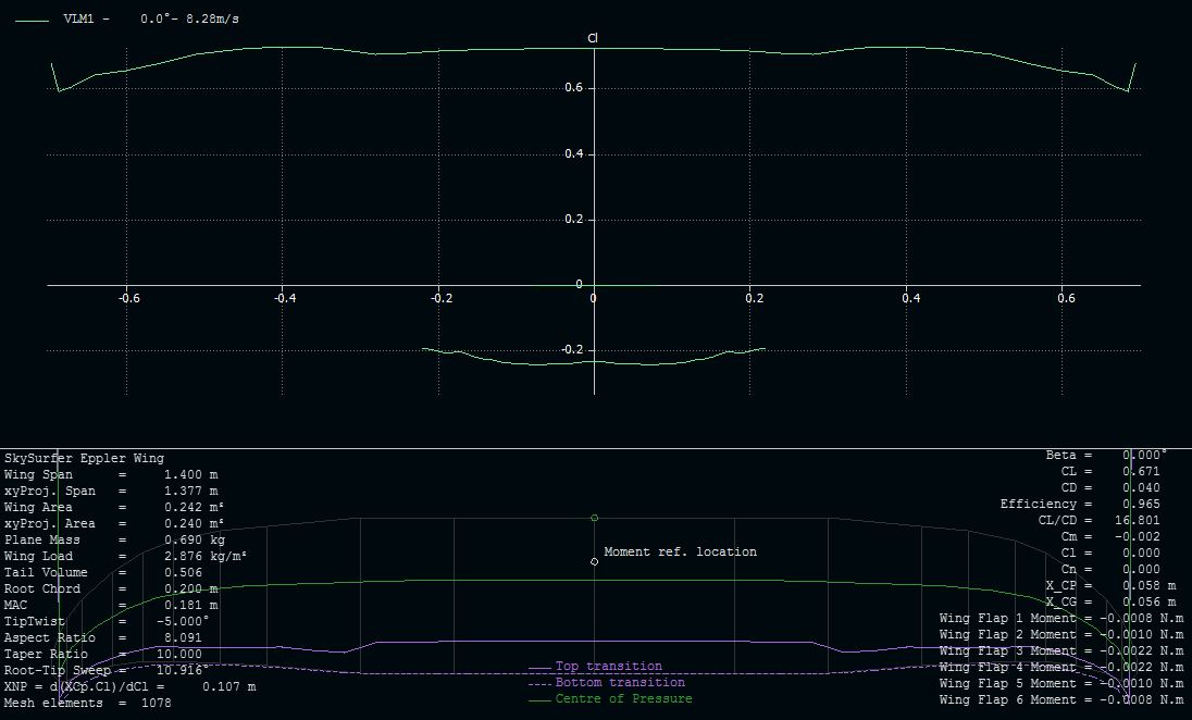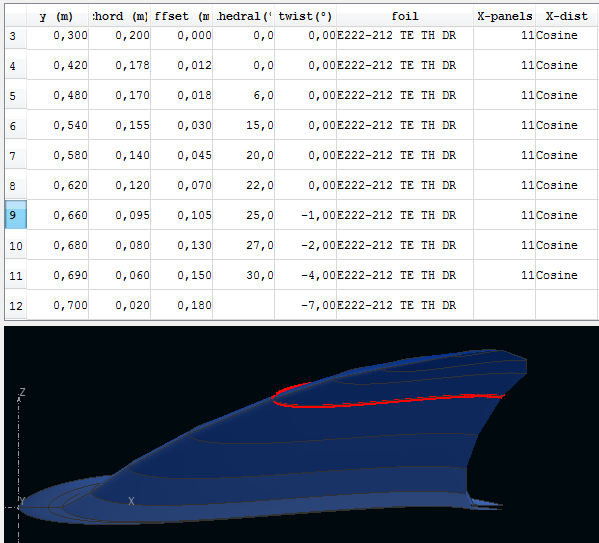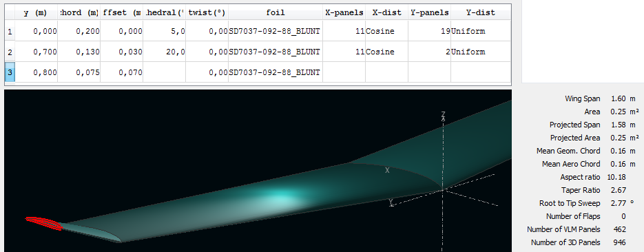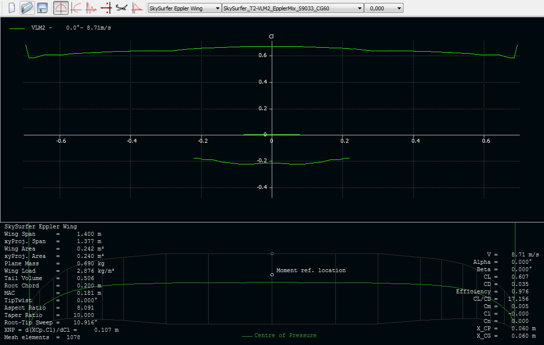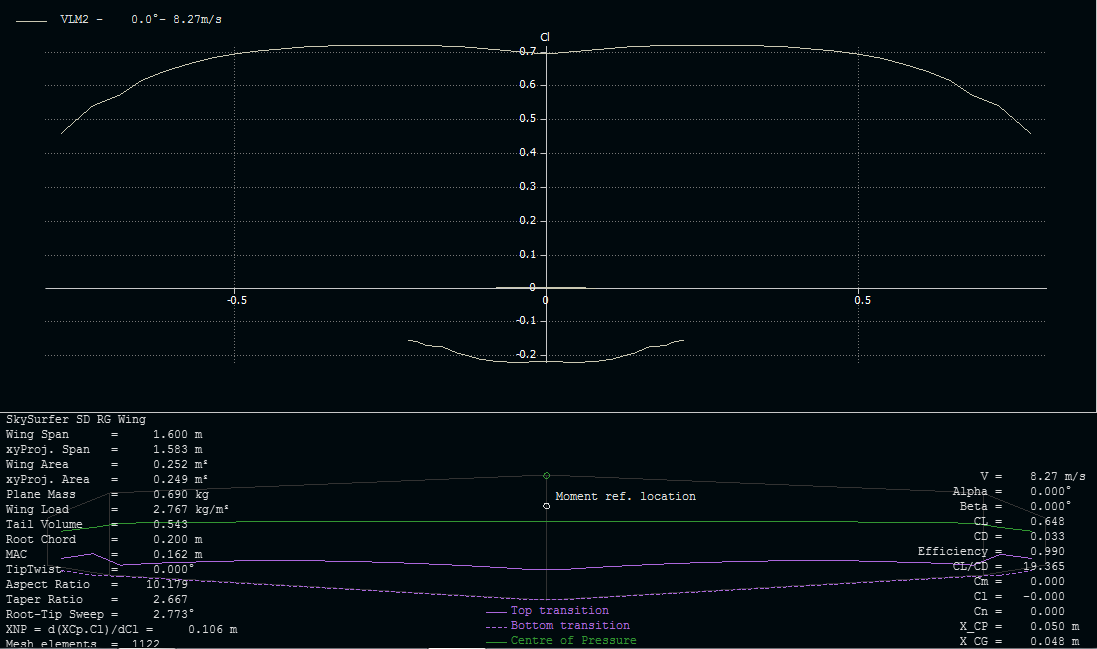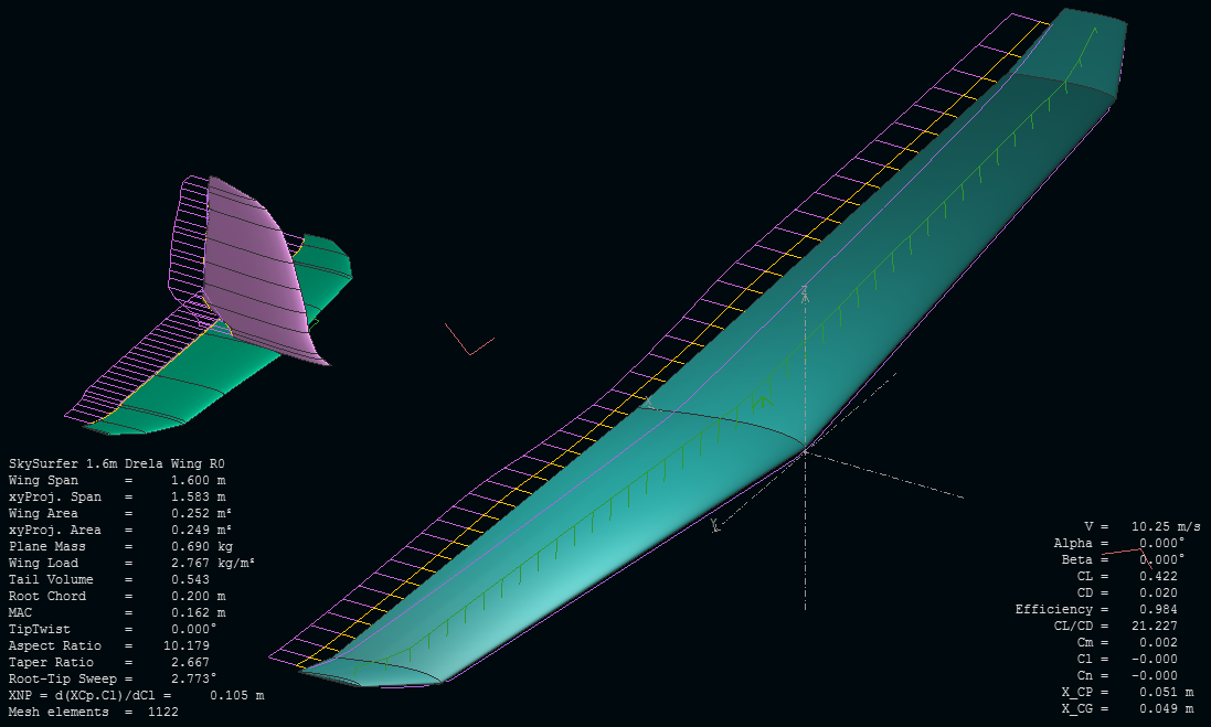 Faltaría por mirar la distribución de sustentación, ya que en la punta de las alas (680mm de cuerda hasta la punta) se veían cosas raras en la distribución de downwash.