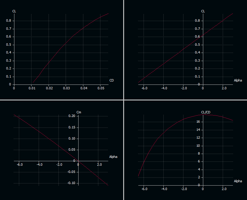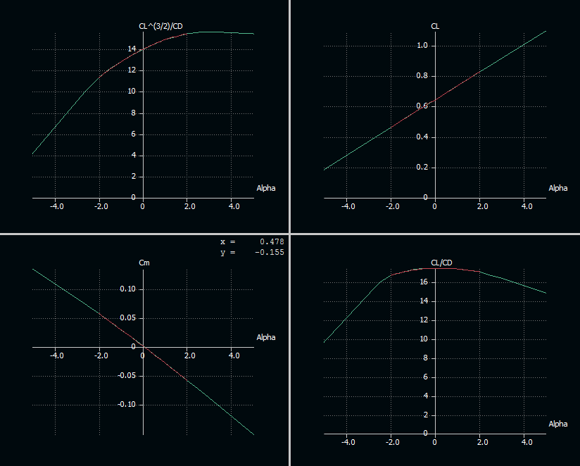 He ajustado con la incidencia del ala el máximo de L/D para 0º de ángulo de ataque, y dejado en 0 el Cm a 0º de ángulo de ataque moviendo el CG. El estabilizador está a 0º.