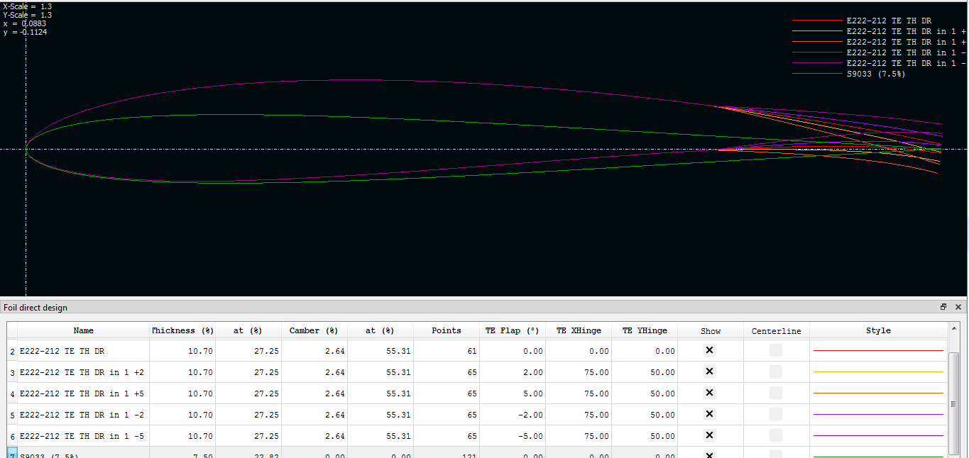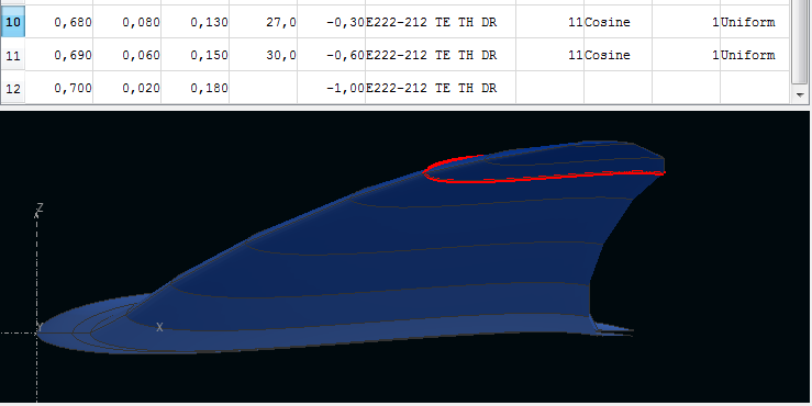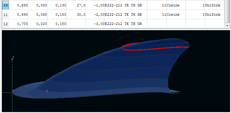 Luego he vuelto a la casilla de salida de los perfiles, y me he generado más polares de cada perfil, cada 0,25grados, y en el caso de la cola empezando por Rn=1.000 para estar cubierto. Por cierto, he visto que no había subido el perfil de borde de salida romo, lo tenéis adjunto, y lo mismo para sus polares.