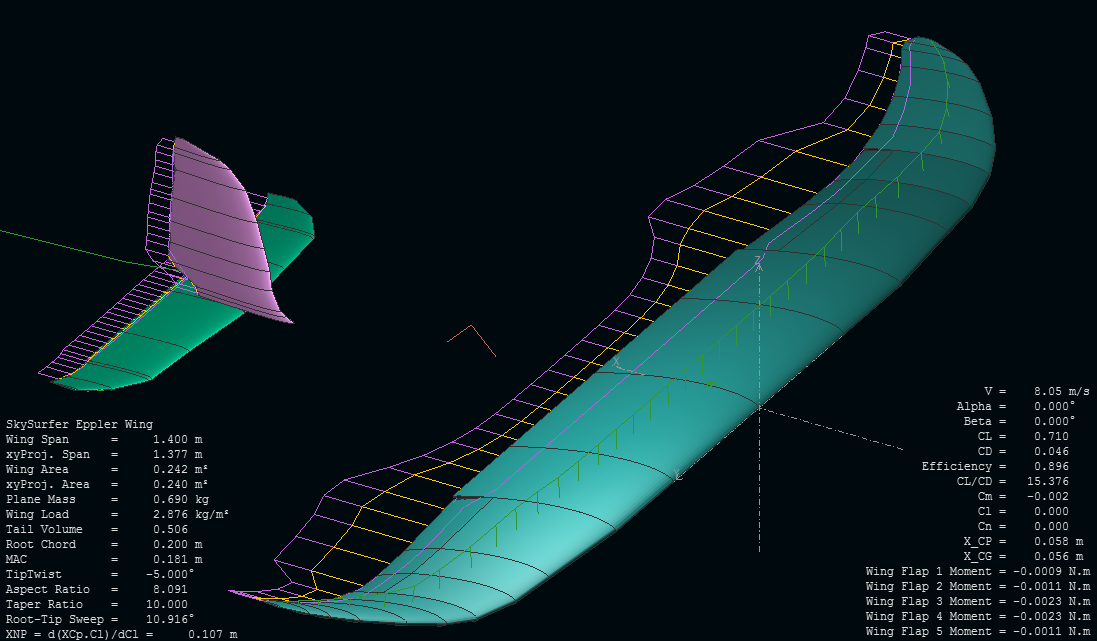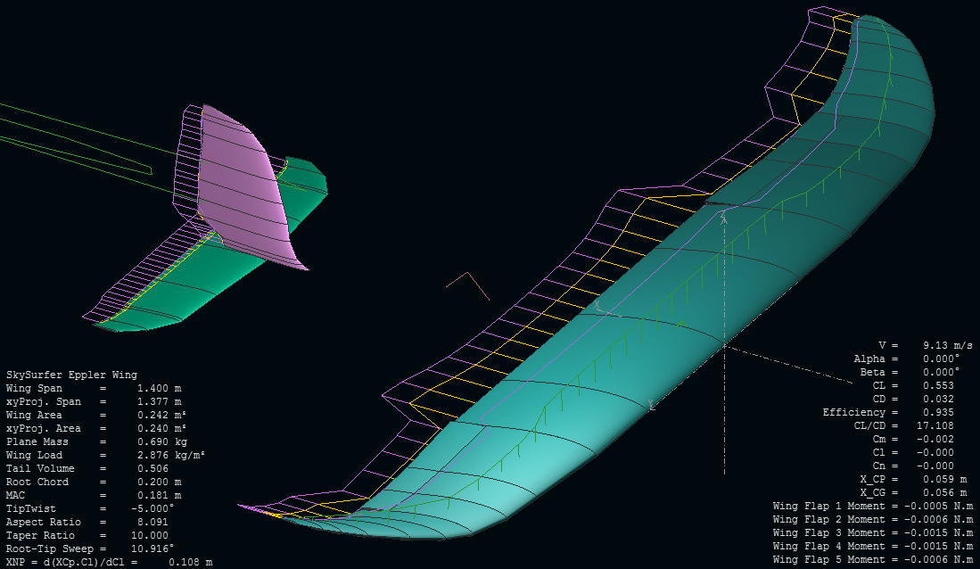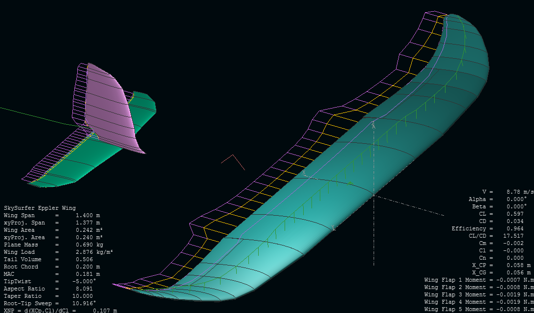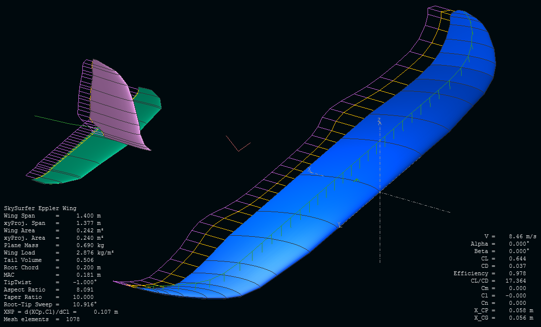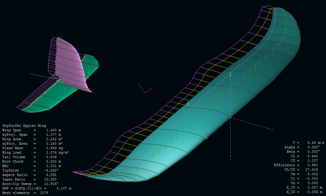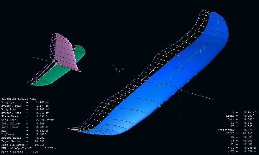 Lo que he hecho hasta ahora es tantear un poco cómo cambia el comportamiento de un ala como la del SkySurfer que hemos deducido tocando un poco alguno de los parámetros menos evidentes más allá de la forma en planta y el perfil en raíz, para ver por dónde andamos y tener un objetivo de mejora.