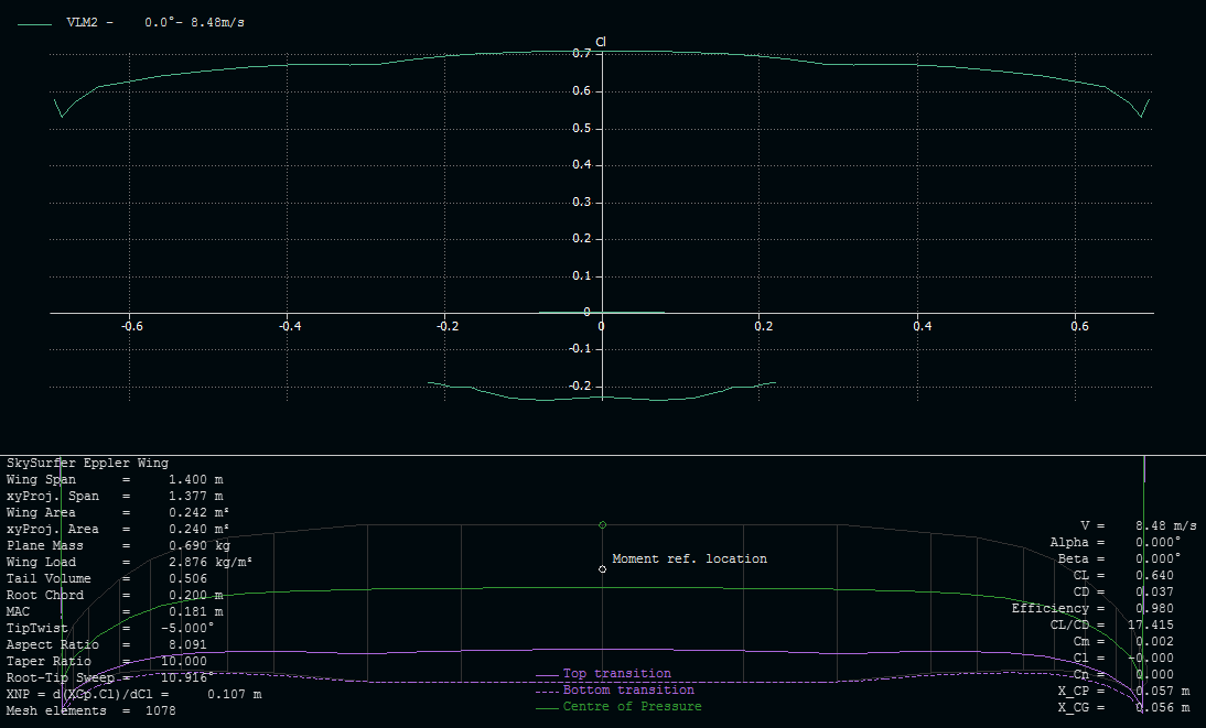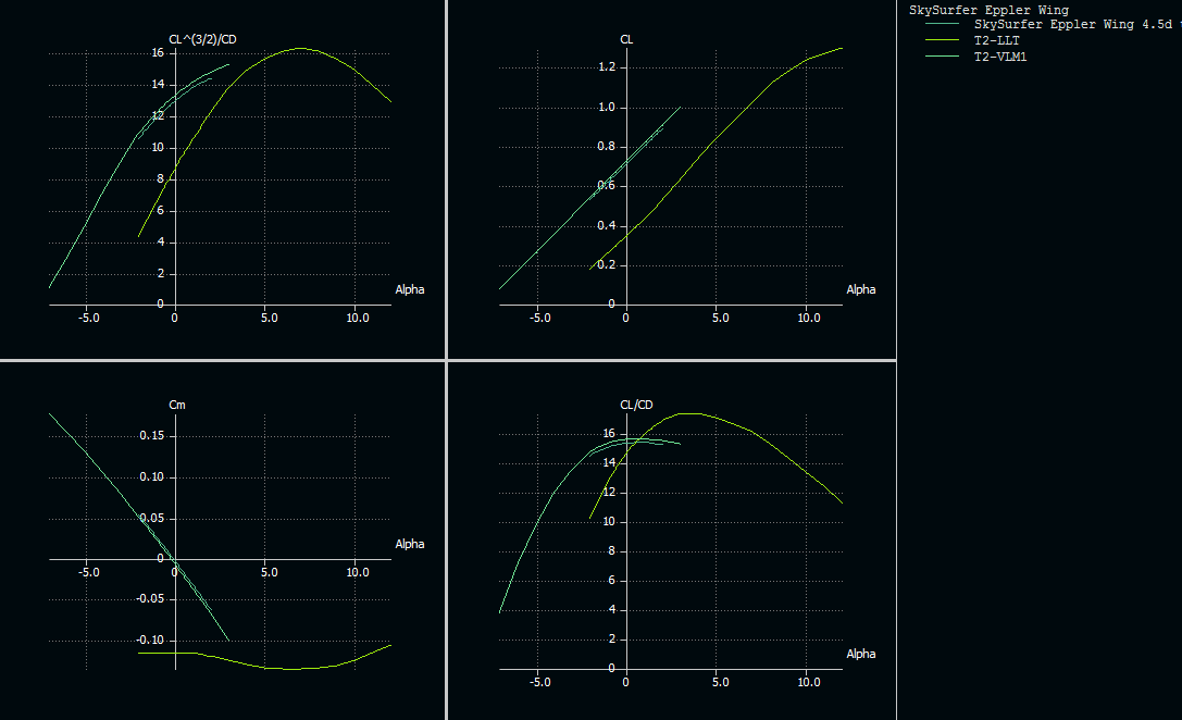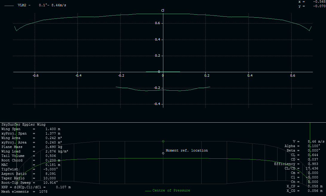 Tened en cuenta que cada tipo de análisis sirve para una cosa. El análisis LLT sirve sólo para el ala, y es el que más va a aguantar cerca de la pérdida. Los métodos de paneles (VLM1, VLM2, 3D) son sólo para la zona lineal y coeficientes de sustentación positivos... y por debajo del máximo del Cl del perfil. Sigue leyendo, que a lo mejor es que la punta necesita un poco de torsión para bajar localmente el Cl al bajar el ángulo de ataque...