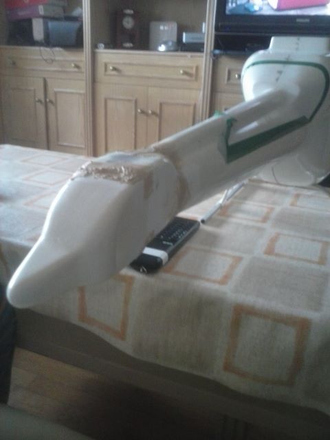 LA PRIMERA Y SEGUNDA FOTO, ES LA COLA DEL FUSE, DESPUES DE CORTAR DE LARGO 4 CM, ADEMAS DE OTROS TRES CM, DESPLAZANDO EL EJE DEL ROTOR HACIA ATRAS, PARA CONSEGUIR UN CENTRO DE GRAVEDAD MAS O MENOS ACEPABLE.