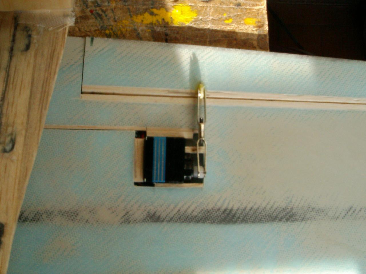 Lo bueno sería poner una tabla contrachapado de 2 o 3 mm y pegarlo o atornillarlo encima. Como aquí hay poco espacio y para que no sobresalga mucho le pongo cinta de cello enrrollando el servo y lo pego con una sola gota ciano, ojo a tener puesto el tornillo del brazo del servo y tener todo el mando centrado, y luego alrededor le pongo unos listones pequeños de balsa con otra gota de ciano.