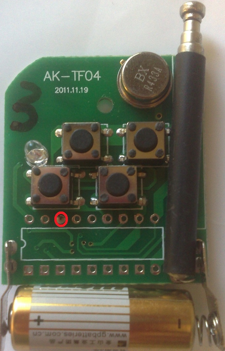 Estas son las fotos que le he hecho hoy al mando, una por la parte de la botonera y otra por la de los componetes. Como puedes apreciar en ellas esta rodeado de rojo el unico puente (entre las dos caras de la placa, supongo) que venia realizado. Decirte tambien que todos los botones son operativos, o sea, enciende el led del mando y ademas en el receptor de 1 canal los empareje.