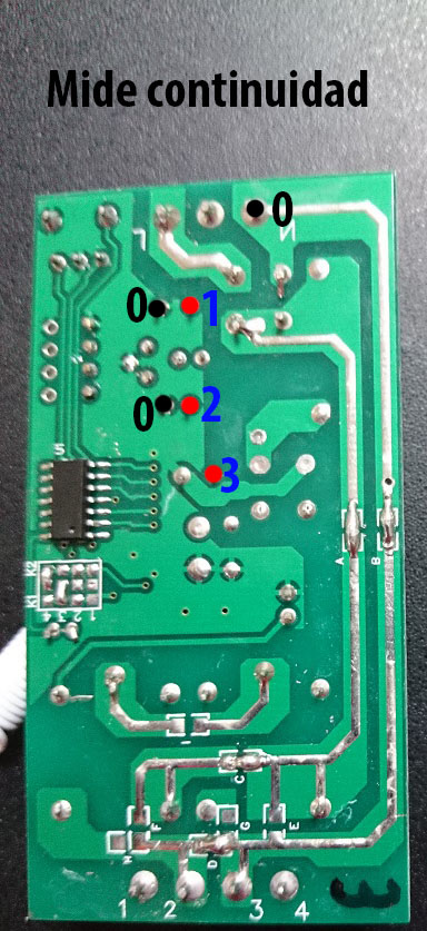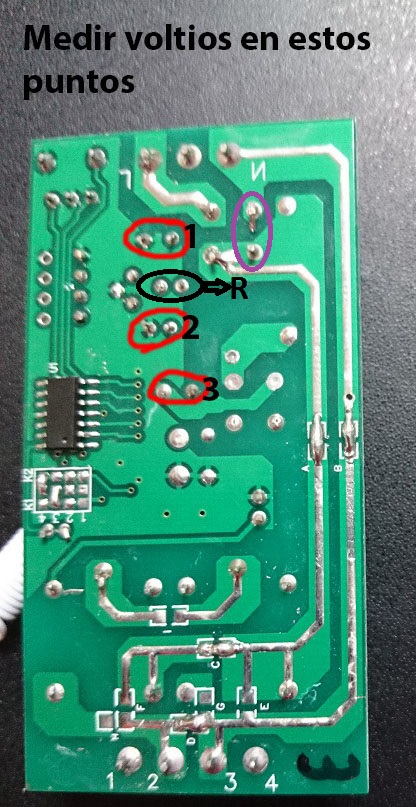 El valor que me da el receptor nº3 es de 149 Ohmios y el nº4 de 147,8. Las he medido por la parte de las pistas ya que por la parte de los componetes me es imposible. La medida la he realizado entre los puntos que me has marcado con los nº 1 y 2. En la imagen en el circulo negro.