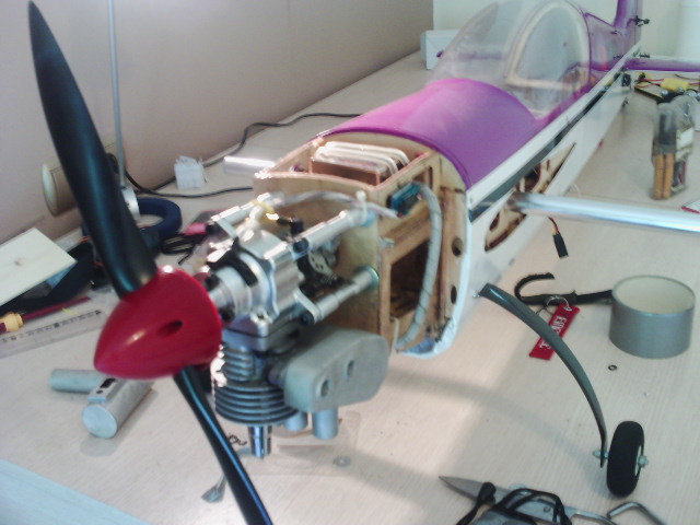 Inició su vida con un OS 91 fx + Bomba Perry , pero tuve que quitarlo pues no tiraba nada, no se si por mal ajuste de la bomba o por que el motor tiene ya sus horas y algun piñazo, pero arranca bien y no se para (en bancada y con bomba , da 9500 a 9700 vueltas con una 14/8 de madera ). Cansado de tocar tornillos le cambie a un RCGF 15 cc que he tenido puesto hasta hace unos dias. Con él, volar volaba pero lo mismo que con el 91 Fx, no se caia, no se paraba pero no subía, en fin que no......creo que es un motor mas indicado para un ala alta tipo Piper de 2mts que para un acrobático de 3 kgs,..... es mi experiencia con ese motor... es posible que con una helice de fibra, mejor ajuste de agujas etc, le saque algo mas de potencia , pero no creo que sea motor para este avion.