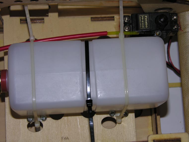 Acto seguido me he liado con el deposito que lleva una curiosa forma de sujeción al fuselaje mediante bridas y soportes de varilla como los empleados en los trenes de aterrizaje, las bridas suministradas en el kit, por cierto cortas. El deposito esta preparado ya para gasolina y es de 550cc según ellos lo montan con tres tubos, pero yo he optado por dos, ya que usare válvula de llenado.