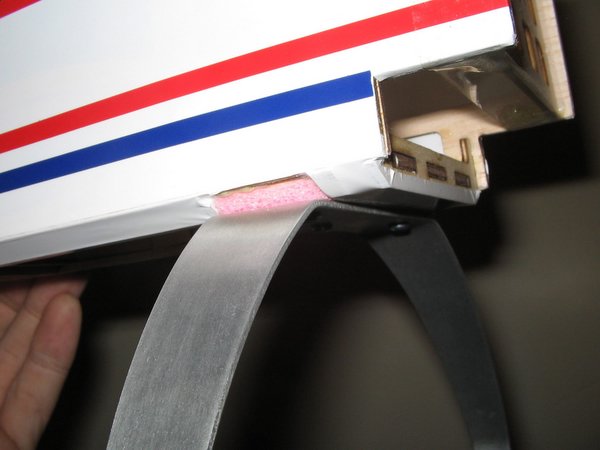 Como estaba harto de reparar y de pegotes de epoxy decidi ponerle solucion. Despues de pensar un rato ( Pobres neuronas) Decidi cambiar la rigidez por algo mas blandito que absorviera los aporrizajes... Que hice? Pues poner un trozo de material de embalar electrodomesticos que es como un EPP mas o menos entre el tren y el fuselaje, de manera que el tren tenia una cierta flexibilidad hacia atras y el material blando se comia el golpe.