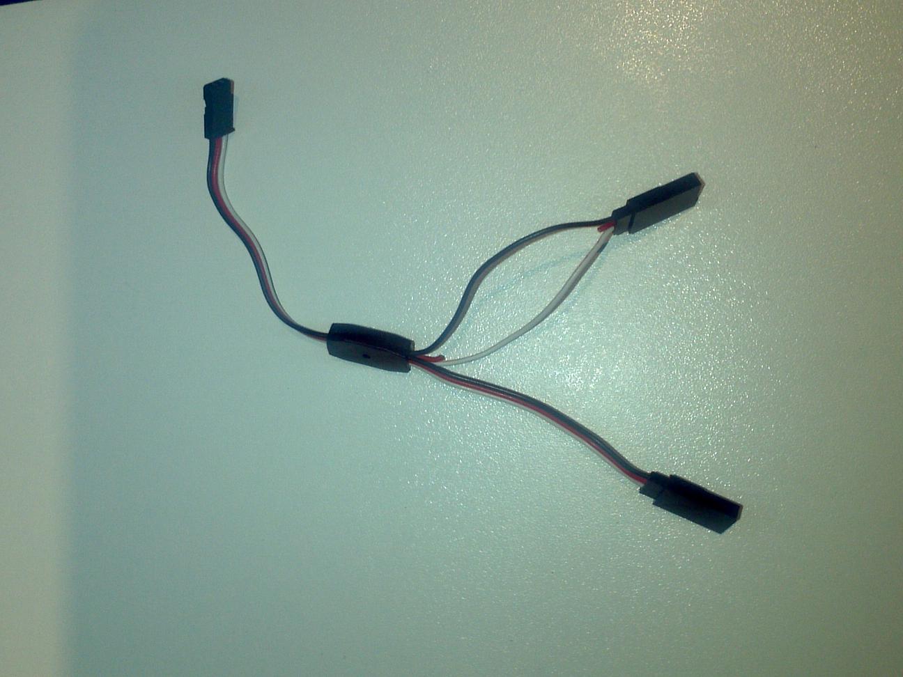 También te dejo una foto de un cable en Y preparado para dos variadores con BEC. Si te das cuenta el cable rojo de una parte del cable en Y está cortado. Estos cables van a los dos variadores, utilizando el BEC del que tiene el cable rojo, y la parte común de la 'Y' va al canal 3 del receptor.
