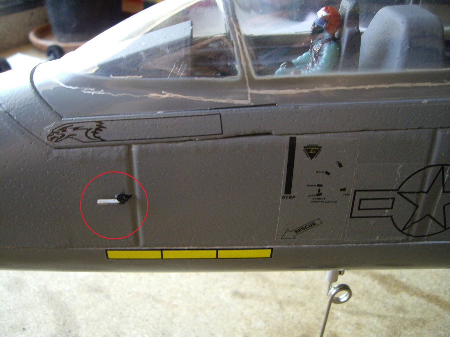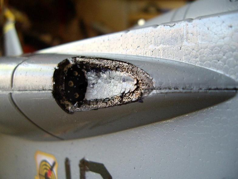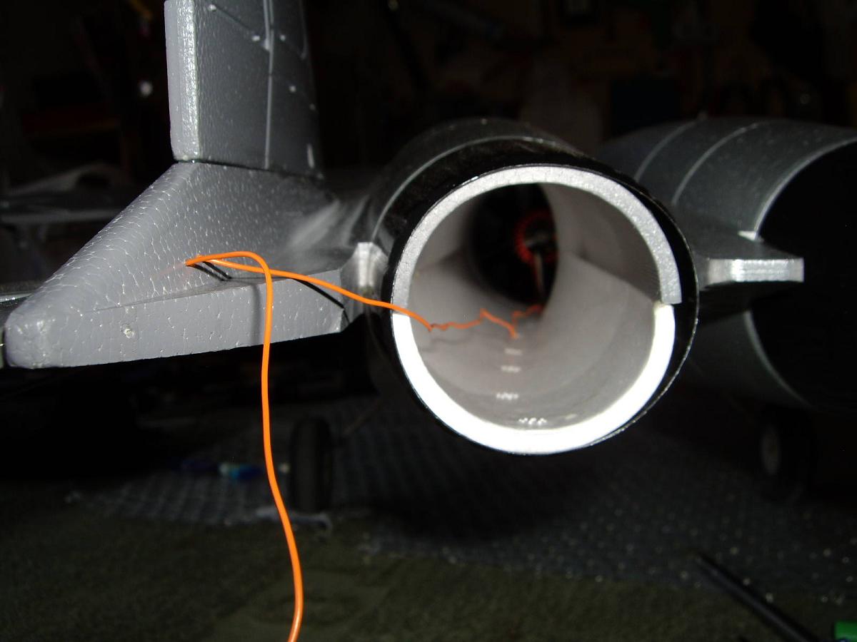 Y así es cómo sale finalmente la antena por la tobera de escape. Apreciad el detalle de la retención de la antena del rx en el foam, para evitar que un "tirón" la arranque "de cuajo": sólo salen unos 15 centímetros de antena.