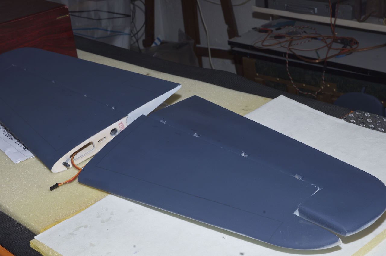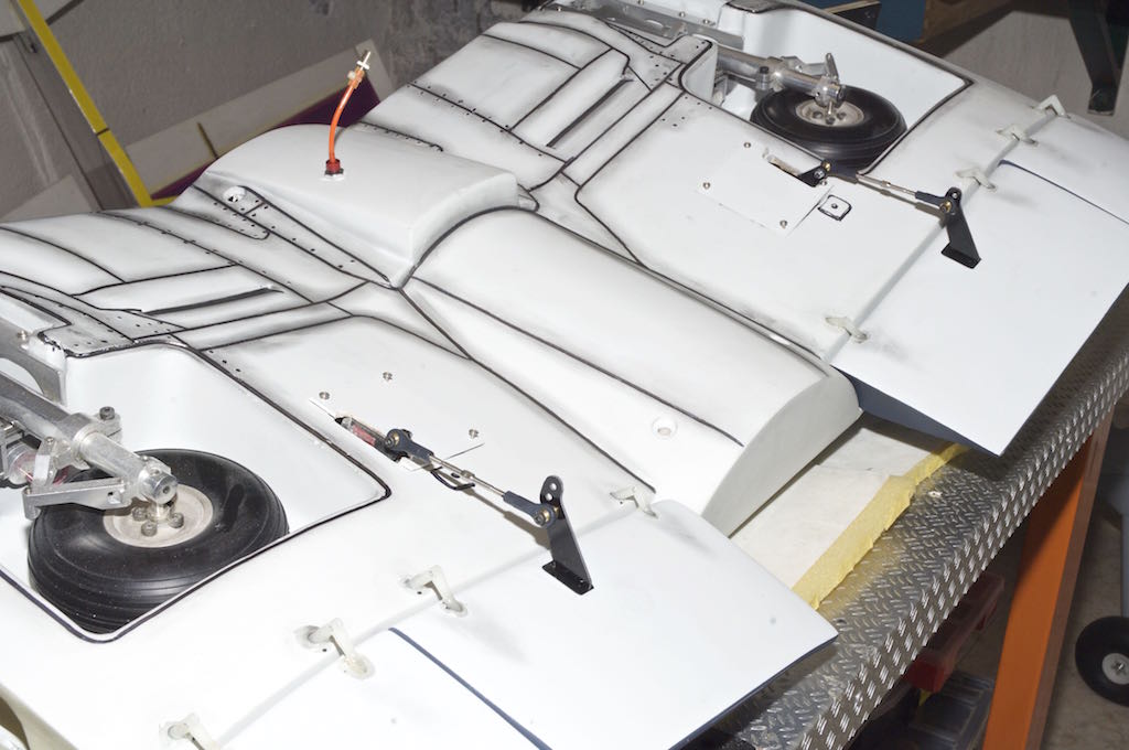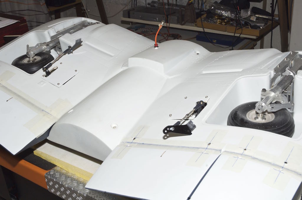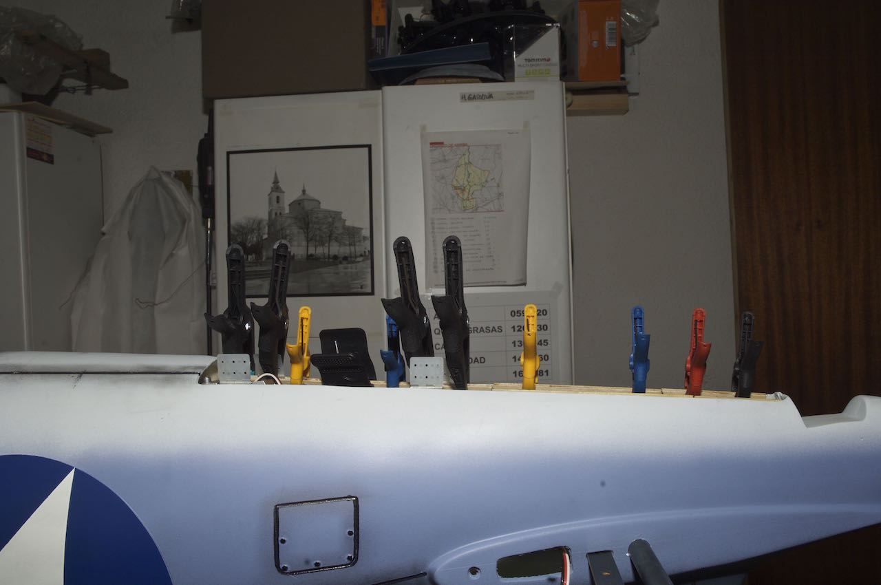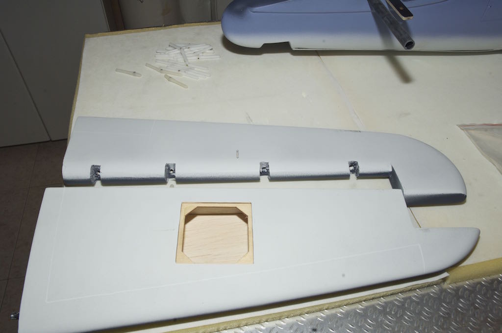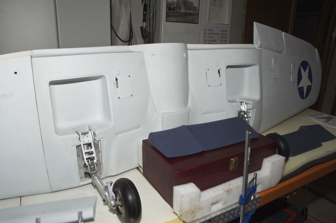 Las alas, vienen en tres partes, creo que es una gran idea y así podemos llevarlo en el coche desmontando las puntas de las alas, llama la atención la parte central de las alas, en molde de fibra de vidrio, es muy fuerte y por lo tanto pesado, pero es la parte del avión que sufre más y por esto no me parece mala idea. Los panelados de las alas están pintados.