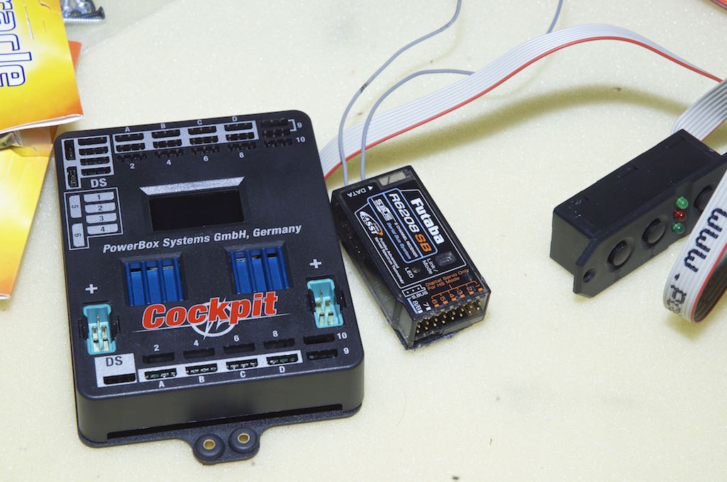 - Para este modelo son necesarios 13 canales, con centralita pasan a ser 5 canales dobles y tres sencillos, por esto y por la seguridad que da la centralita, voy a poner un receptor de 8 canales en 2,4 y la centralita COCKPIT de PowerBox.