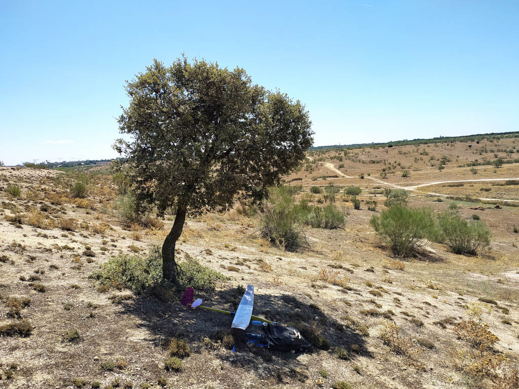 Mediados de agosto, llego a la ladera a las 11:45. El viento entre rachas es más bien flojo, las rachas todavía no son muy fuertes, parece que están pasando térmicas, alguna rapaz a lo lejos y buitres muy altos. Menos mal que una pequeña encina resiste en medio de la ladera y puedo montar a su sombra. Compruebo que todo está Ok y voy a la zona de lanzamiento. Espero a que suba un poco la brisa, lanzo y no hay nada, ni ladera ni térmica ni nada, prefiero no ir muy bajo entre las retamas y planeo directo al fondo del "valle" donde hay una amplia zona sin obstaculos para aterrizar sin problemas. Toca paseo, es lo que tiene no llevar motor, menos mal que no estoy alto: 20 mts de desnivel y 300 metros ida y vuelta, en 5 minutos estoy otra vez listo para lanzar. Segundo intento, espero a un poco más de brisa, esta vez rasco un poco entre pelotazos y turbulencia, el perfil de altura parece un electrocardiograma con taquicardia, como la que tengo en esos momemtos. Intento girar una burbuja con poca altura, pero es estrecha y turbulenta, me salgo, entro en perdida y me quedo bajo, intento recuperar entre las retamas pero estoy muy bajo y termino en una que acoge y sujeta con cariño al X-RES. Segundo paseito, ¿que pasa hoy?.