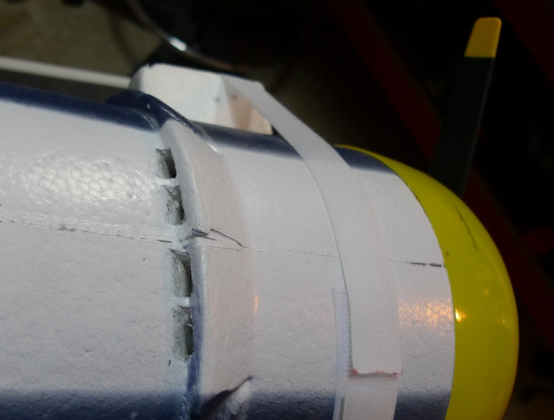 Lo segundo, ha sido abrirle cuatro aberturas, en la parte inferior (mejor ver foto) para evitar la sobre presión en el interior del fuselaje. Como digo parece que funciona.
