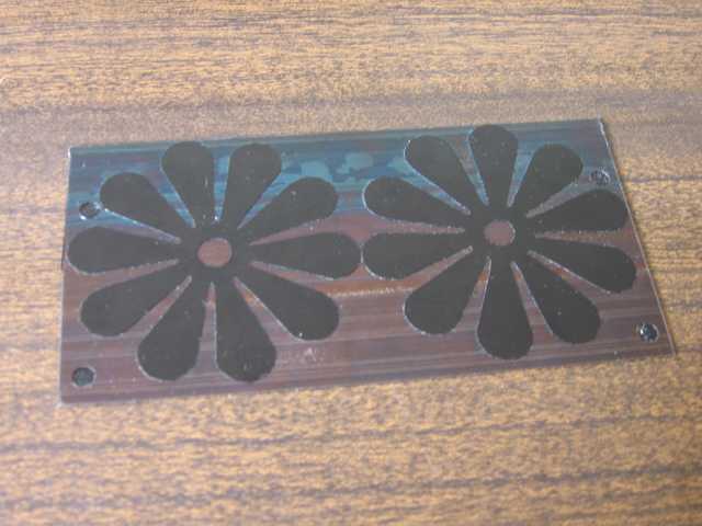 He consegido meter dos margaritas en una chapa, asi pues, el resultado es el de la foto, imagen antes de meter en acido, la otra cada esta totalmente tapada, lo negro es vinilo.