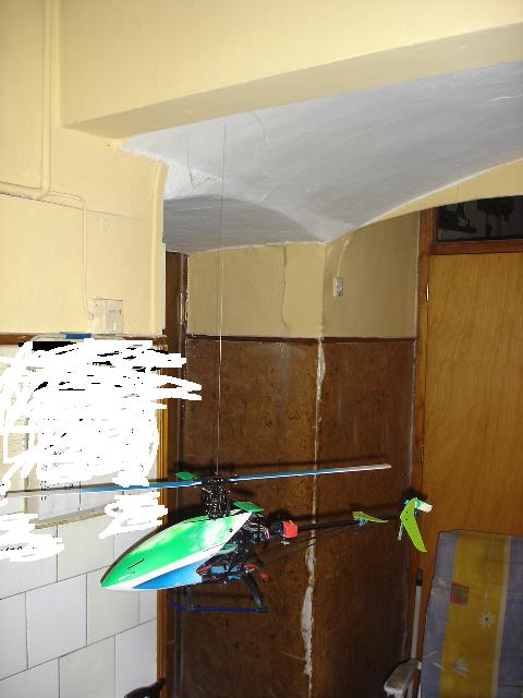 aqui el heli ya colgado por el rotor, sin lipo podeis ver como esta desequilibrado